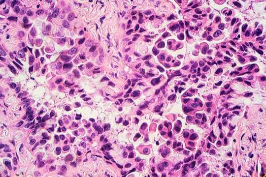 A type of lung cancer cell reflective of adenocarcinoma, one of many types of lung cancer cells. David Litman/Shutterstock.com